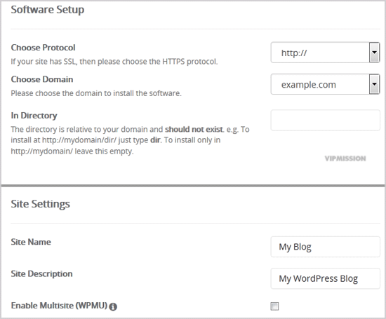 - In Directory: If you want to install this in a directory, for example example.com/directory, enter the directory name. Otherwise, leave this blank to install in your main domain example.com