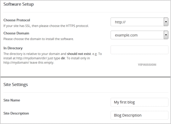 • In Directory: If you want to install this in a directory, for example example.com/directory, enter the directory name. Otherwise, leave this blank to install in your main domain example.com
