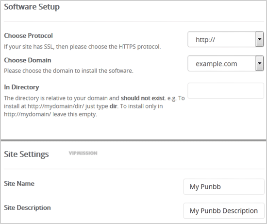 • In Directory: If you want to install this in a directory, for example example.com/forum, enter the directory name. Otherwise, leave this blank to install in your main domain example.com