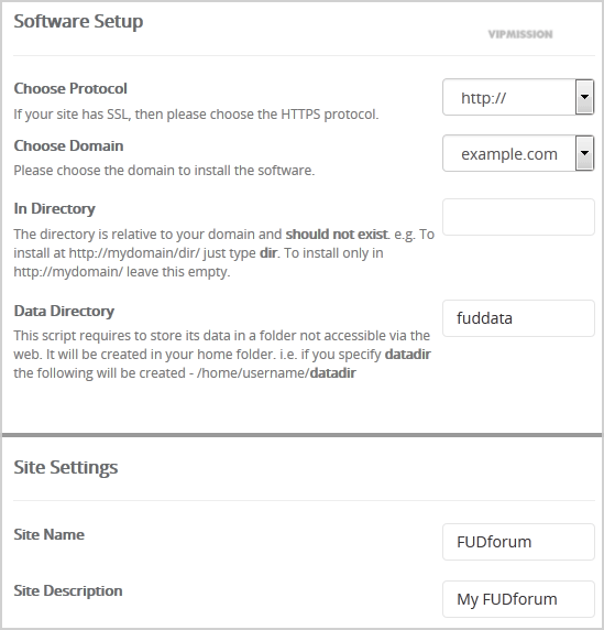 • In Directory: If you want to install this in a directory, for example example.com/forum, enter the directory name. Otherwise, leave this blank to install in your main domain example.com
