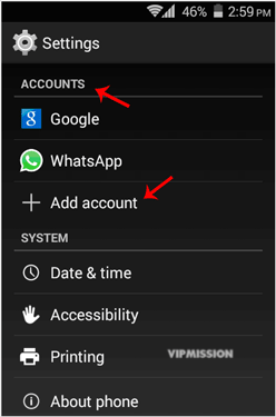 1. Open your android mobile, go to the main menu and the "Settings" options, and under the "Accounts" option, tap on "+ Add Account".